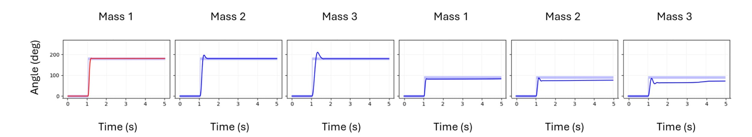 An example of how PID performance degrades outside its’ region of tuning is shown in the 6 graphs below. A pendulum using a PID controller was tuned to position itself at 180 degrees with a “mass 1” attached, as per the red line graph. The mass was changed to represent an industrial load variation as show by “mass 2” and “mass 3” as shown in the 2nd and 3rd graphs. As the mass changes we see how the blue lines start to overshoot. In the final 3 graphs, the target position was changed from 180 degrees to 90 degrees without adjusting the tuning. You can see the blue lines undershooting. This over- and under-shooting is unacceptable from a control system perspective.