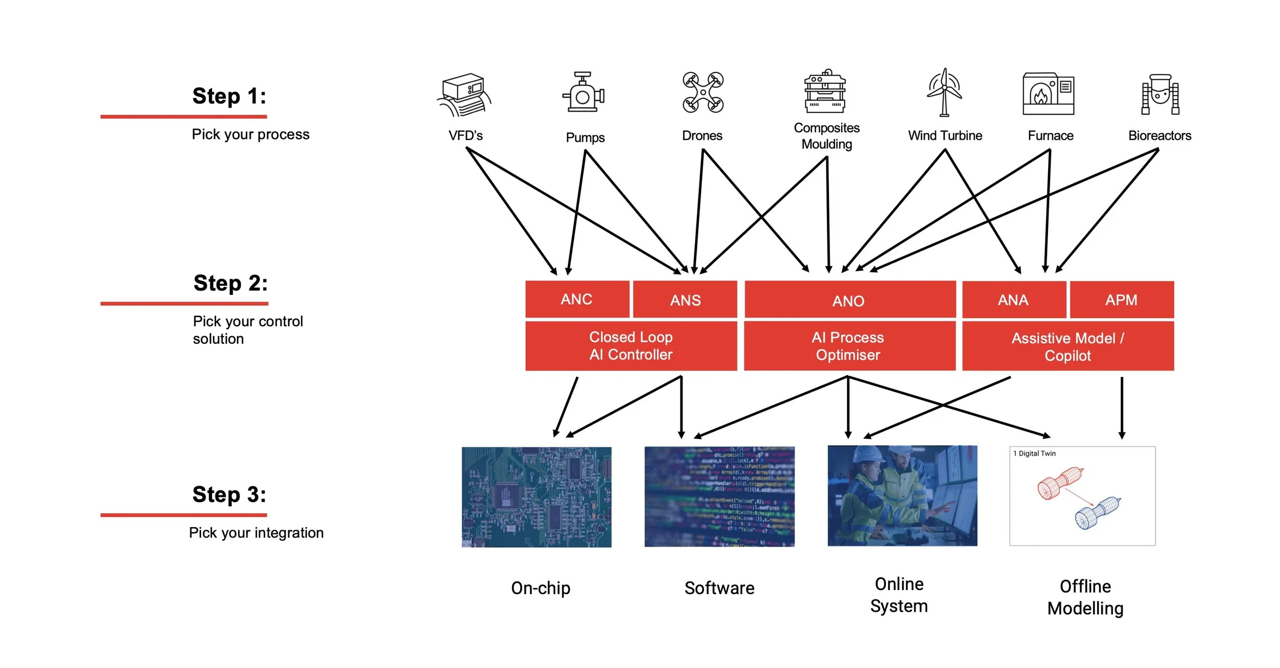 Given their compute efficiency and versatility, Adaptive AI controllers can be deployed into almost any architecture such as on-chip, embedded C++ function blocks, or offline advisory and modelling systems.